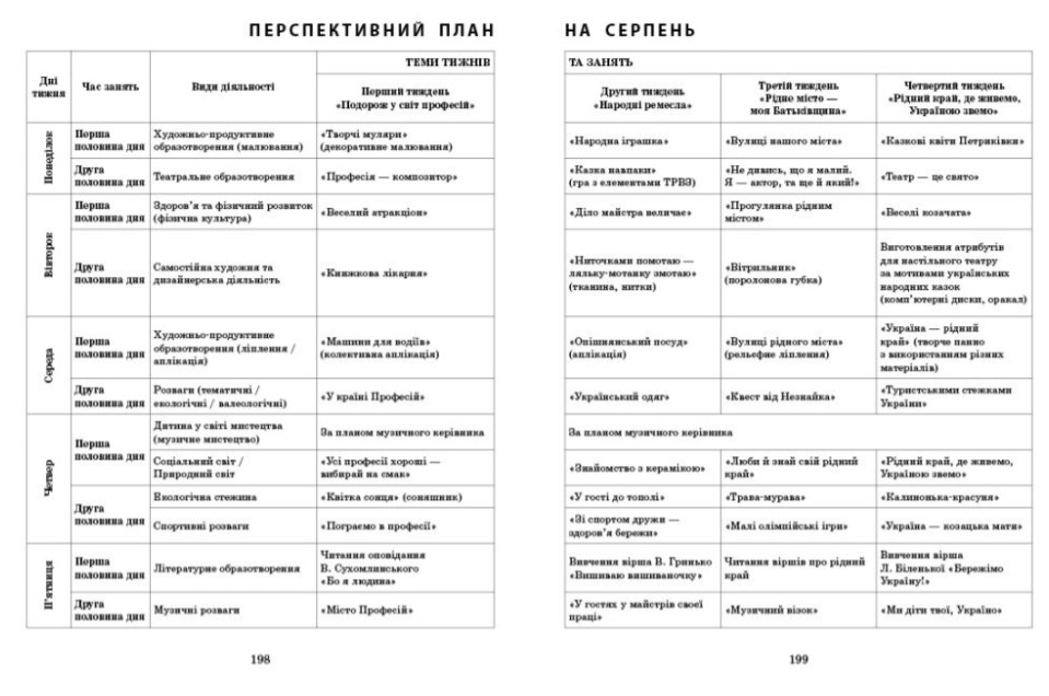 У посібнику подано перспективний та розгорнутий календарний план освітньої роботи з дітьми групи старшого віку. Він складений за блочно-тематичним принципом із урахуванням вимог Базового компонента дошкільної освіти, затвердженого Наказом Міністерства освіти і науки України.