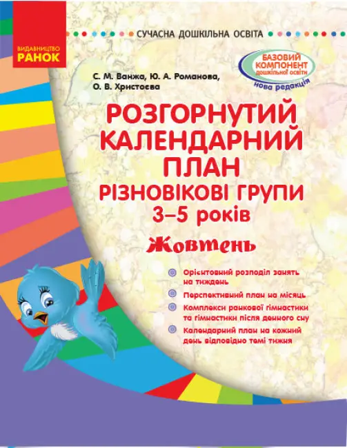 У посібнику подано перспективний та розгорнутий календарний план організації навчально-виховного процесу у різновіковій групі з дітьми 3–5 років. Вони складені за блочно-тематичним принципом, що забезпечує змістову цілісність, системність, послідовність, ускладнення та повторення матеріалу протягом тематичного тижня.