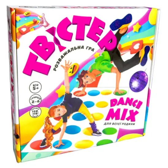 «Твістер dance mix» – рухлива гра для дітей і дорослих. Вмикайте музику, крутіть рулетку та грайте досхочу. Правила дуже прості – виграє той, хто зміг втримати рівновагу найдовше за інших. Така гра не тільки розвеселить малечу, а й допоможе їм навчитися взаємодіяти з однолітками. Яскраве поле для Твістера має розмір 150х110 см, і завдяки міцному матеріалу воно може стати навіть зручним килимком для пікніку. Вік: 5+. Кількість гравців: 2-6. Комплектація: ігрове поле, рулетка.