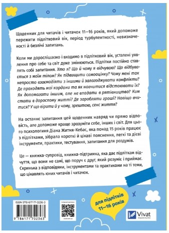 На останнє запитання цей щоденник навряд чи прямо відповість, але допоможе краще зрозуміти себе, інших і світ. Для цього психологиня Діана Житня-Кебас, яка понад 15 років працює з підлітками, зібрала короткі й цікаві пояснення, легкі та дієві інструменти, практики, тестування, запитання для роздумів.