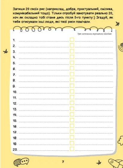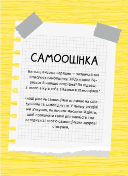 Це — книжка-супровід, книжка-підтримка, яка дає підліткам відчуття, що вони не самі, що поруч є друг, який розуміє і приймає. Скринька з відповідями, інструментами та практиками на ті теми, що цікавлять юних читачів і читачок