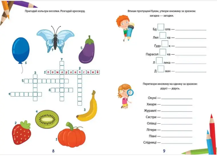 Книжка ідеально поєднує пізнавальний і розважальний елементи. Разом з її героєм, Буквоїдом, діти виконають цікаві мовні завдання: відшукай слова по колу, знайди зайві слова, перетвори однину на множину, розгадай кросворд і багато інших. Завдання надзвичайно корисні та заохочують до навчання.