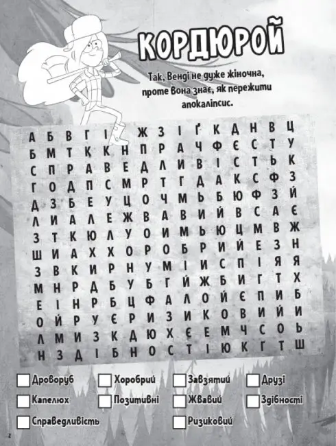 Цікаво, що приховує ця книжка? Авжеж загадкові пригоди близнюків Діппера та Мейбл і їхніх друзів. На сторінках безліч головоломок, розфарбовок й, звичайно, таємниць. Приготуйтеся вирушати у цікаву подорож разом із улюбленими персонажами Ґравіті Фолз!