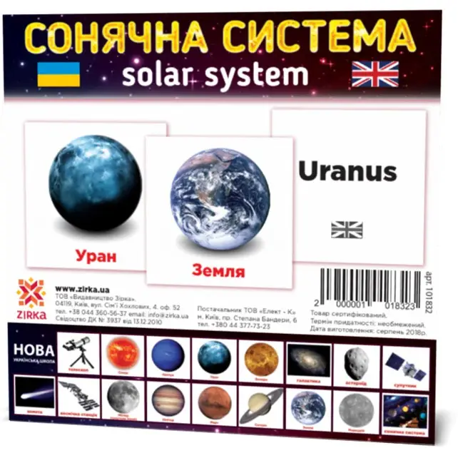 Тематичний комплект картонних карток із зображенням планет та об’єктів Сонячної системи та зазначених назв для всіх, хто вивчає англійську мову. За допомогою додатку можна почути, як вимовляються назви об’єктів 2 мовами.