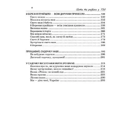 Посібник призначений допомогти музичним керівникам і вихователям в організації свят і розваг у ДНЗ. Він містить значну кількість сценаріїв свят і розваг за віковими групами (від 3-го до 6-го року життя). Проведення свят сприятиме емоційному, музичному, соціальному розвитку дітей, допоможе розвинути в дітях комунікативність, товариськість і зробити колектив більш дружним.