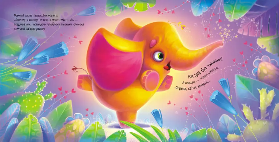 Це історія про слоника, який уперше вирушив гуляти без мами. Він був радий і почувався дуже дорослим. Але звірі, яких він зустрічав, насміхалися зі слоненяти, адже в нього такий довгий ніс, великі вуха й саме воно чималеньке. Слоненя так засмутилося… Добре, що мама знає, як розповісти малюкові, що бути слоном дуже гарно!