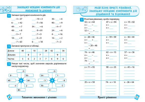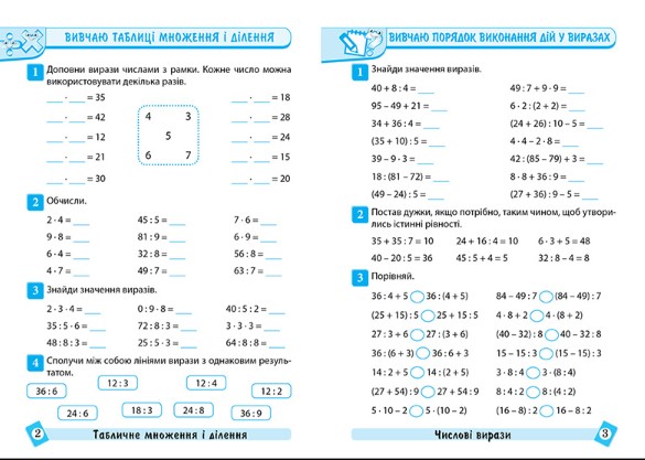 Тренажер містить завдання з основних тем математики для учнів 3 класу. Підібрані завдання дозволять учням не тільки розвинути обчислювальні навички, а й навчать знаходити раціональні шляхи вирішення вправ і задач.