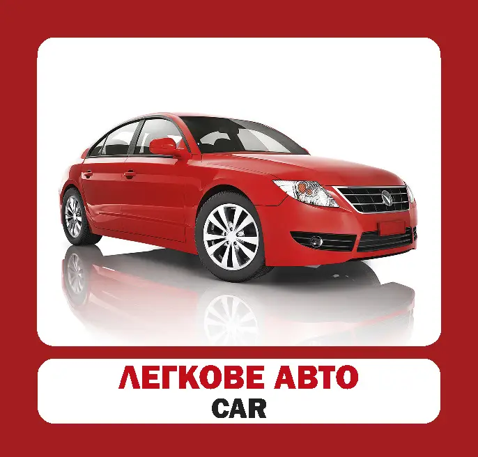 До набору «Транспорт» входить 17 англійських слів з транскрипцією на зворотному боці і переклад українською. Лексикон вашого малюка збагатиться такими словами: легкове авто, вантажівка, пожежний автомобіль, таксі, швидка допомога, автобус, трамвай, потяг, тролейбус, фунікулер, метро, літак, пароплав, поливальна машина, трактор, комбайн, автокран.
