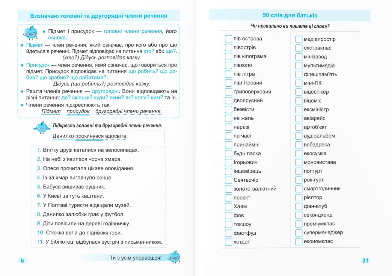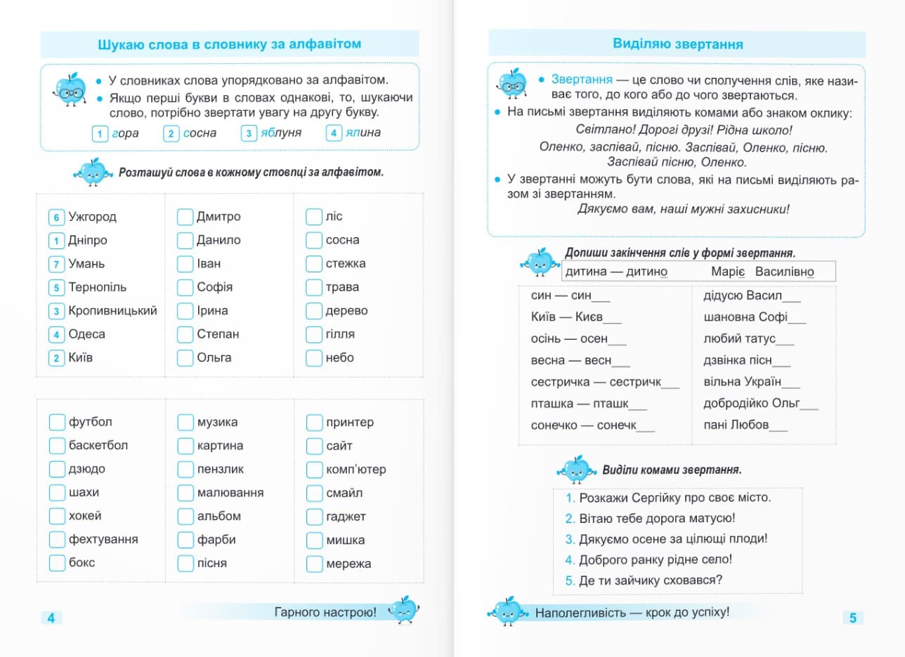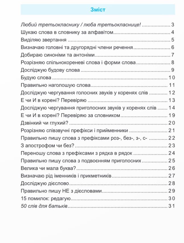 У навчальному посібнику дібрано бліцзавдання для формування у третьокласників навичок грамотного письма. Ці завдання учитель може запропонувати як для виконання на уроці, так і для самостійної роботи вдома в умовах дистанційного навчання чи на канікулах.