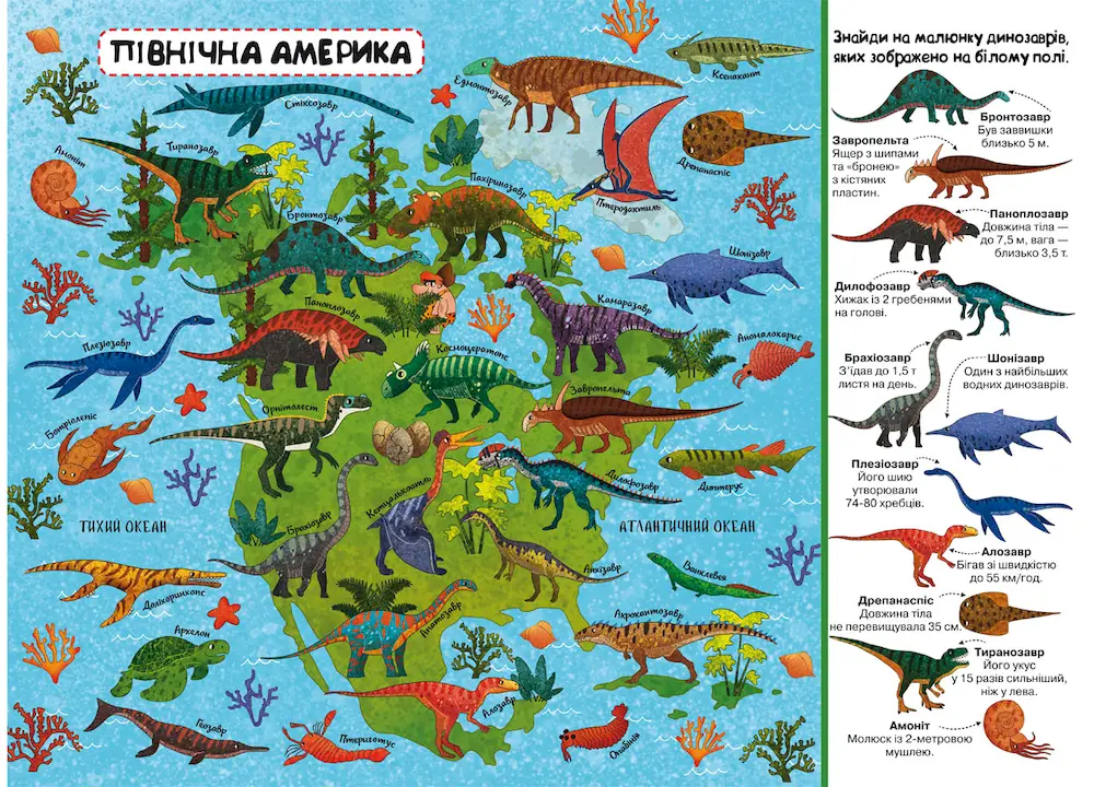 Пропонуємо Вашій дитині познайомитися з динозаврами — тваринами, що мешкали на планеті багато мільйонів років тому. Разом з нашим віммельбухом малюк відвідає всі материки й дізнається, які давні ящери там жили. У книжці-віммельбусі безліч яскравих і барвистих малюнків, розглядаючи які можна не тільки відкривати для себе щось нове, але й вигадувати власні історії, виконувати цікаві завдання-ігри.