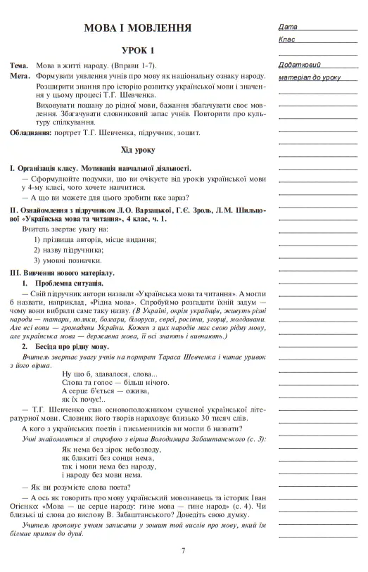 У посібнику подано розгорнуті конспекти уроків з української мови, зміст яких відповідає Державному стандарту початкової освіти, Типовим освітнім програмам та підручнику «Українська мова та читання 4 клас, ч. I» (автори Варзацька Л.О., Зроль Г.Є., Шильцова Л.М.). Запропоновано зразки бесід під час вивчення нового матеріалу, опорні схеми, різні види робіт над мовним матеріалом, калігра- фічні хвилинки, творчі завдання, цікавий ігровий матеріал. Для вчителів початкових класів, студентів педагогічних навчальних закладів.