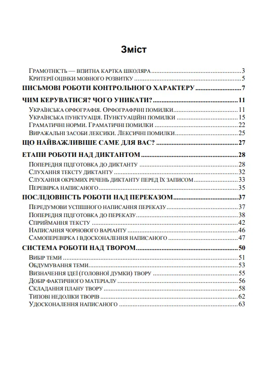 Посібник призначений для підготовки до зовнішнього незалежного оцінювання та ДПА з української мови. У виданні подаються поради щодо цілеспрямованої самопідготов-ки до письмових робіт контрольного характеру — диктантів, переказів, творів, наводяться приклади типових помилок, вказуються орієнтири для їх запобігання і виправлення. Посібник призначений для випускників загальноосвітніх навчаль-них закладів та учителів-словесників.
