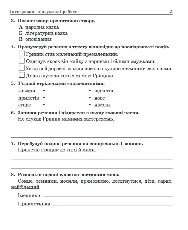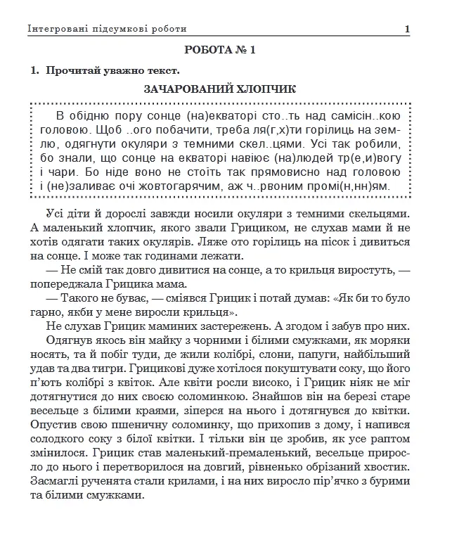 Зміст посібника відповідає Державному стандарту початкової освіти та Типовим освітнім програмам. У посібнику подано 8 інтегрованих робіт для підготовки та проведення державної підсумкової атестації. Кожну роботу побудовано на основі художнього тексту, в якому виділено частину для списування (з пропущеними орфограмами), запропоновано завдання для перевірки розуміння змісту тексту, знань з мови і мовлення, а також творче завдання.
