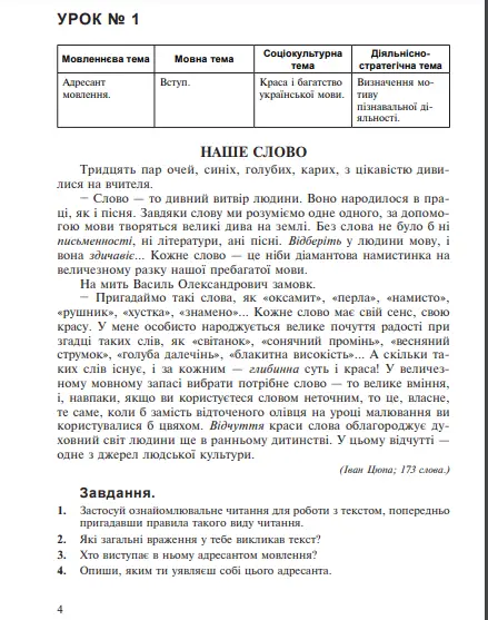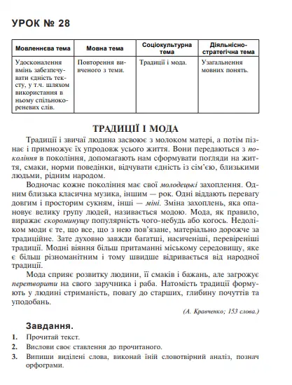 У робочому зошиті вміщено тексти до кожного уроку з української мови у 6 класі (I-й семестр), які дадуть можливість організувати спільну діяльність вчителя та учнів з вивчення предмета за чотирма змістовими лініями — мовною (вивчення лексики, іменних частин мови), мовленнєвою (аудіювання, читання вголос і мовчки, говоріння та письмо монологічного і діалогічного характеру), соціокультурною (розширення кругозору з українознавства, етики, історії мистецтва), діяльнісною (формування умінь аналізувати, порівнювати мовні та позамовні явища, наводити приклади, систематизувати, робити висновки). До текстів додано завдання, спрямовані на розвиток орфографічних, граматичних, стилістичних та комунікативних умінь учнів, їхніх творчих здібностей. Для учнів 6-х класів, учителів та батьків загальноосвітніх шкіл.