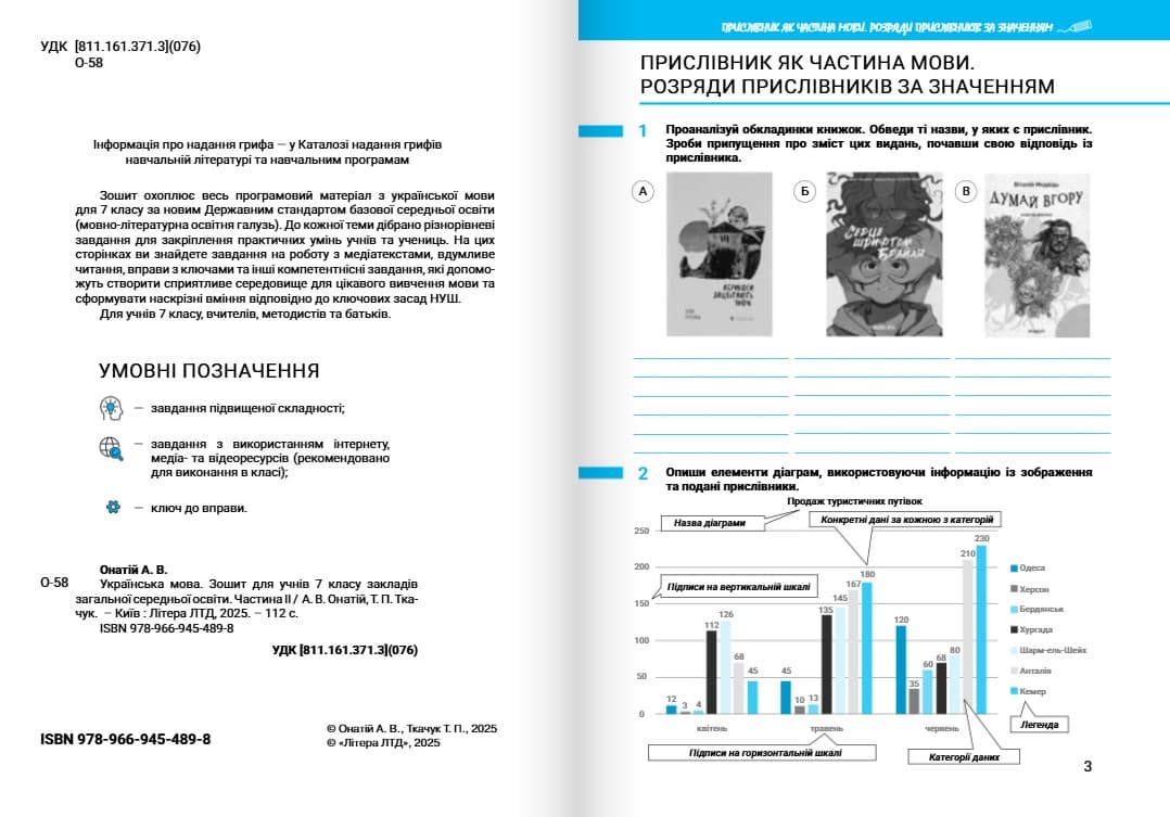 Зошит з української мови для 7 класу охоплює весь програмовий матеріал з української мови за новим Державним стандартом базової середньої освіти (мовнолітературна освітня галузь). Кожна тема містить різнорівневі завдання для закріплення практичних умінь учнів та учениць. На сторінках зошита ви знайдете роботу з медіатекстами, завдання на вдумливе читання, вправи з ключем та інші компетентнісні завдання, які допоможуть створити середовище цікавого вивчення мови та сформувати наскрізні вміння відповідно до ключових засад НУШ.