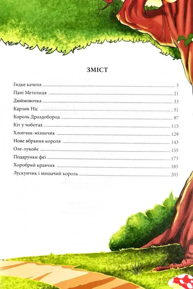 Дітям дуже подобаються казки, адже в них добро завжди перемагає зло, а історії завжди мають щасливий кінець. Ваш малюк доторкнеться до скарбів народної мудрості й разом з казковими героями перенесеться в чарівний світ казки. А чудові яскраві ілюстрації допоможуть розвитку концентрації, уяви і пам’яті дитини. Наведені в кінці кожної казки запитання допоможуть перевірити й розвинути увагу дитини. Гидке каченя (Ханс Кристиян Андерсен), пані МЕТЕЛИЦя (Брати Якоб і Вильгельм Грімм) ДЮЙМОВОЧКА (Ханс Кристиян Андерсен) КАРЛИК НіС (Вильгельм Гауф) КОРОЛЬ ДРОЗДОБОРОД (Брати Якоб і Вильгельм Грімм) КіТ у чоботах (Шарль Перро) хлопЧИК-мізинчик (Шарль Перро) НОВЕ вбрання КОРОЛЯ (Ханс Кристиян Андерсен) ОЛЕ-ЛУКОЙє (Ханс Кристиян Андерсен) ПОДАРунКИ ФЕї (Шарль Перро) ХоРоБРиЙ кравчик (Брати Якоб і Вильгельм Грімм) лусКУНЧИК і МиШачИЙ КОРОЛЬ (Ернст Теодор Амадей Гофман)