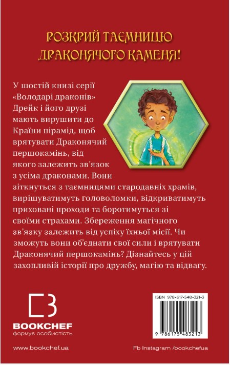 У шостій книзі серії «Володарі драконів» Дрейк і його друзі мають вирушити до Країни пірамід, щоб врятувати Драконячий першокамінь, від якого залежить зв’язок з усіма драконами. Вони зіткнуться з таємницями стародавніх храмів, вирішуватимуть головоломки, відкриватимуть приховані проходи та боротимуться зі своїми страхами. Збереження магічного зв’язку залежить від успіху їхньої місії. Чи зможуть вони об’єднати свої сили і врятувати Драконячий першокамінь? Дізнайтесь у цій захопливій історії про дружбу, магію та відвагу.