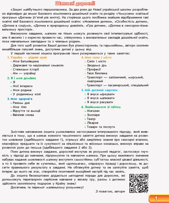 Навчальний посібник «Зошит майбутнього першокласника. За два роки до Нової української школи» спрямований на підготовку дитини до шкільного життя в родині, групах дошкільних навчальних закладів, у центрах розвитку дитини.