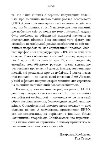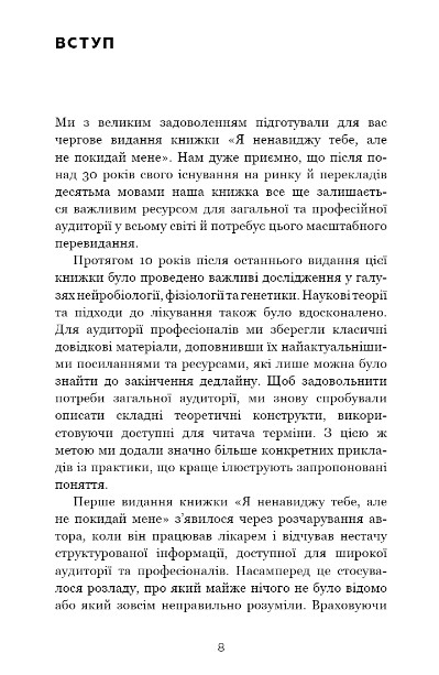 «Я ненавиджу тебе, але не покидай мене» — доповнене й оновлене видання психологічного бестселера, який дає змогу зрозуміти людей із емоційно нестабільним розладом особистості. Автори доступно пояснюють нейробіологічні та генетичні передумови розвитку цього розладу і його зв’язок із алкогольною й наркозалежністю, сексуальними зловживаннями, ПТСР, СДУГ тощо. У книзі подано інформацію про фармакологічну й психологічну терапії, а також поради щодо того, як скористатися набутою інформацією, щоб глибше зрозуміти «важких» людей і налагодити стосунки з ними.