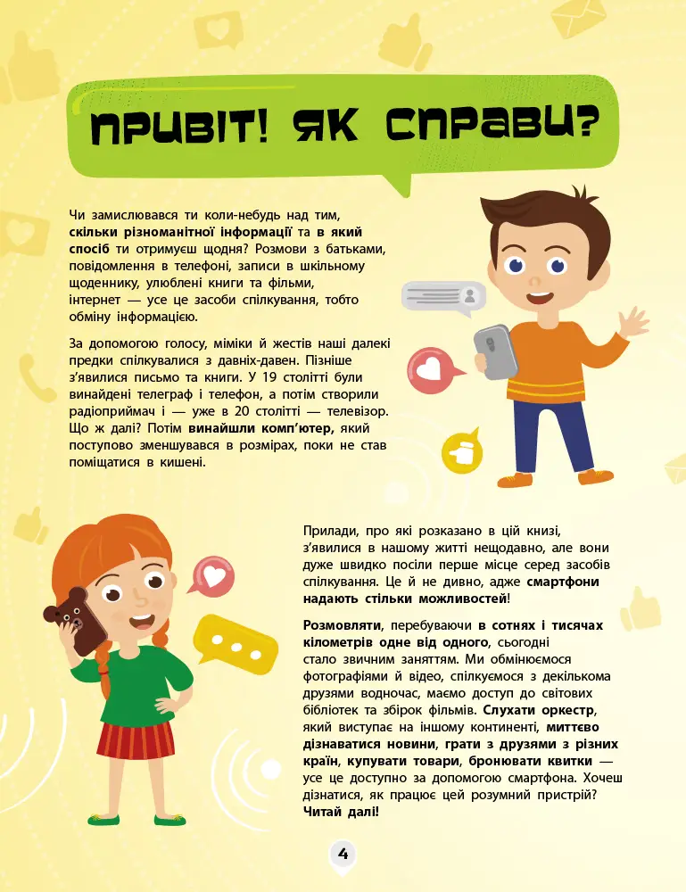 Смартфони з’явилися нещодавно, і вони вже вирішують складні завдання за допомогою міні-комп’ютерів, знімають короткометражні фільми, використовуючи камеру з високою роздільною здатністю, і пов’язують людей з різних куточків планети за допомогою інтернету. У книзі зібрана інформація про історію створення розумних телефонів, про їхню будову і про найпопулярніші та найважливіші функції, про які мусить знати кожна сучасна людина.