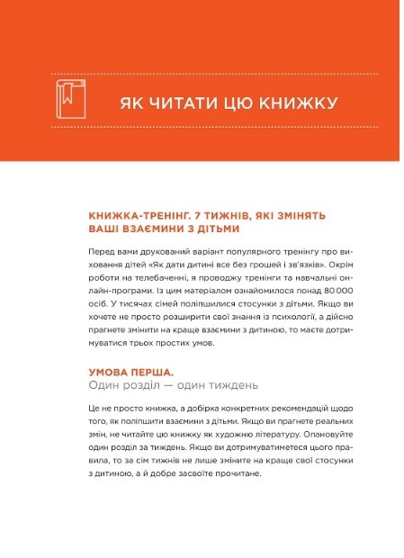 Книга «Як дати дитині все без грошей і зв’язків» — це 7-тижневий тренінг, який поліпшить ваші стосунки з дитиною, навчить вас взаємодіяти, чути свою дитину і розуміти її. Вправи, наведені в кожному розділі, допоможуть закріпити навички усвідомленого батьківства та виведуть вас на новий рівень відносин в сім’ї та в суспільстві. Батьки бажають своїй дитині тільки кращого: щоб вона стала успішною та реалізувалася в житті. Але чи думають вони, що найкраще саме для їх дитини? У той час як вони реалізують свою потребу в званні кращого батька, їхні діти «страждають» від батьківського виховання та заборон.