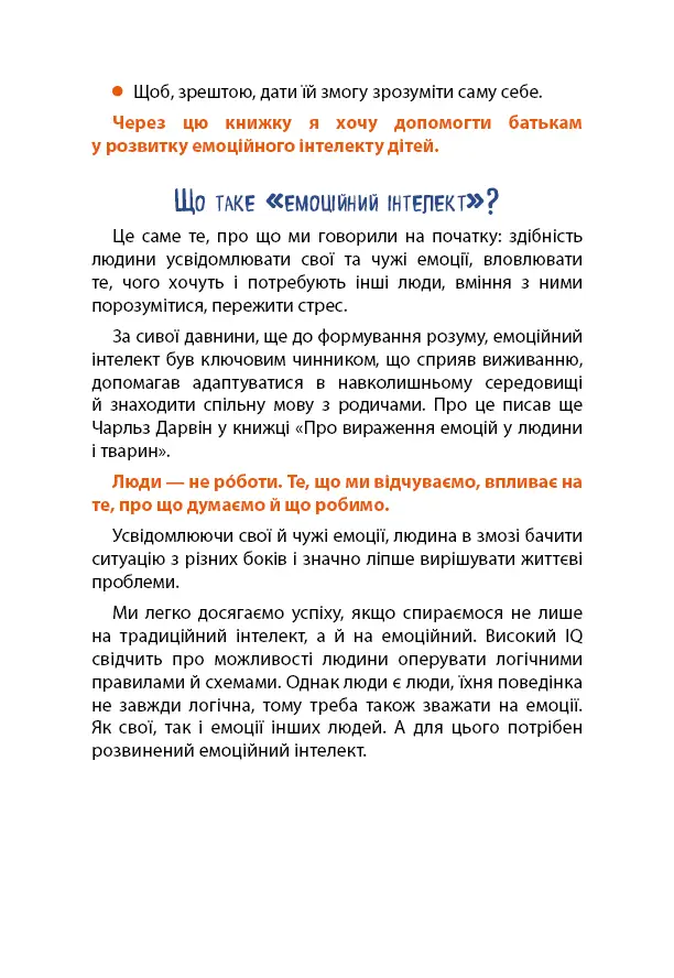 Всім відомо, що люди – не роботи, і, на відміну від машин, ми відчуваємо різні емоції. Починаючи з раннього дитинства, малюк розуміє, що певні ситуації чи події викликають у нього відповідні відчуття. Але як керувати емоціями і, зокрема, як подружитися з ними, він ще не знає. Автор Анна Бикова вирішила допомогти батькам і їхнім дітям, видавши цю книгу-тренінг. Поради у книзі зображають різні наукові підходи до формування емоційного інтелекту дитини, але – в ігровій формі. Інтерактивні розповіді і завдання зацікавлять вашого малюка і крок за кроком допоможуть створити емоційну гармонію.