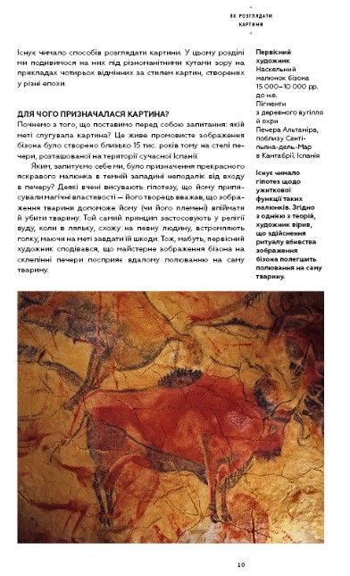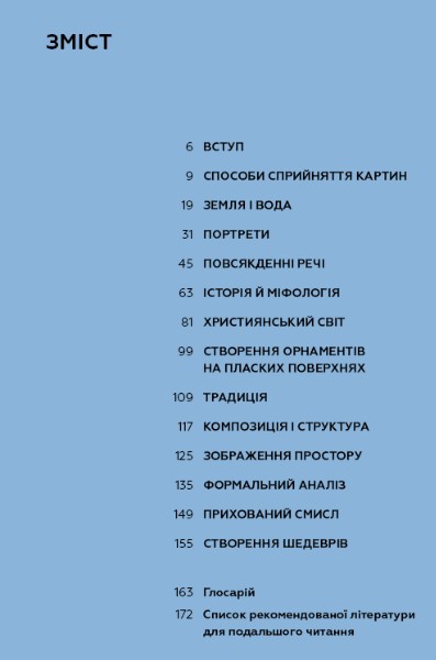 У цій книзі описано й проаналізовано картини з різних аспектів: розглянуто популярні в живописі сюжети й дивовижне розмаїття прийомів їх відтворення на полотні; технічні проблеми, з якими стикаються художники та в який спосіб вони їх вирішують, часто з неперевершеною винахідливістю долаючи труднощі; і навіть приховані смисли й натяки.