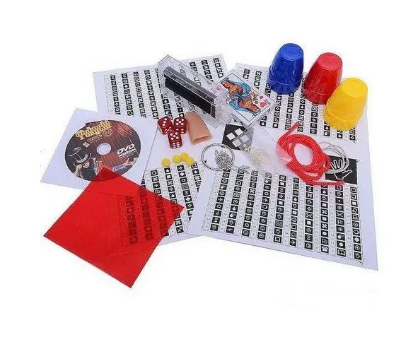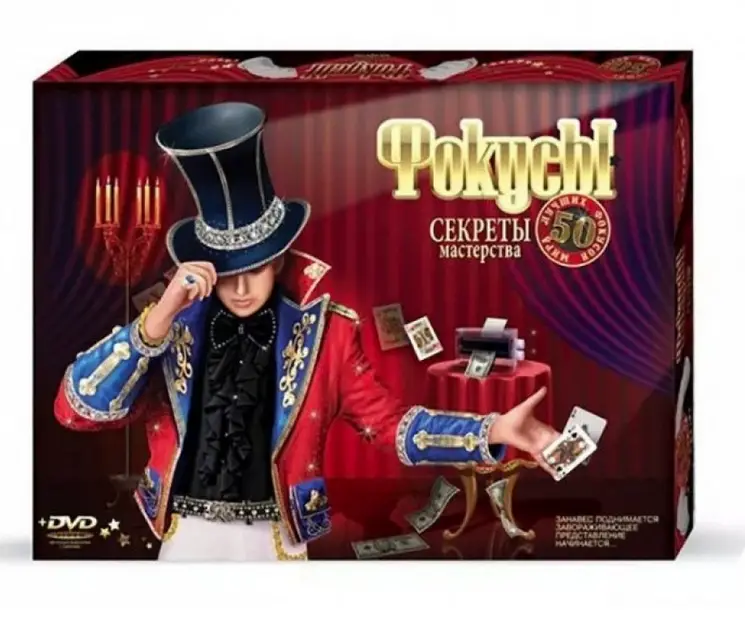 Набор фокусника секреты фокусов фокусы 50шт 50 лучших фокусов мира – большой набор захватывающих фокусов! Инвентарь для демонстрации фокусов: «волшебная машинка», превращающая бумагу в деньги, кольцо на цепочке, платок, исчезающий в кулаке, «волшебные колпачки», «магические кубики», гвоздь, прокалывающий палец (без травм), расходные материалы, колода карт с вариантами сценического представления, различные исчезающие предметы, элементы для театрализации простых фокусов. Набор содержит подробную пошаговую инструкцию, содержащую полное описание всех возможных фокусов + диск с обучающими видео уроками!