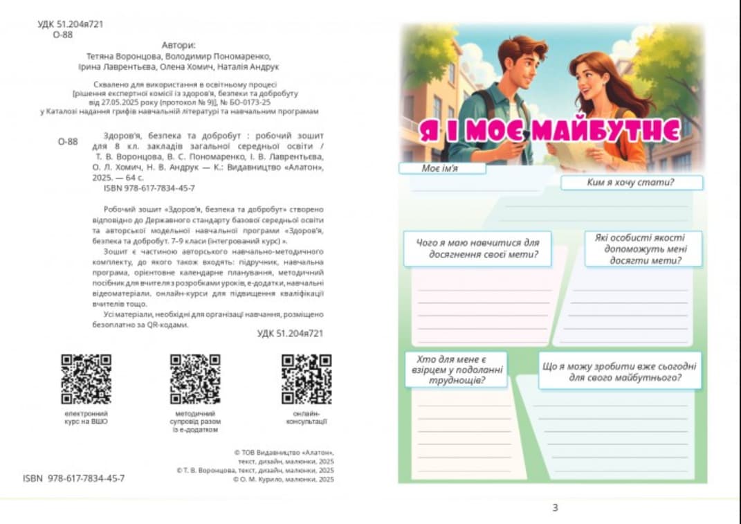 Робочий зошит «Здоров’я, безпека та добробут» створено відповідно до Державного стандарту базової середньої освіти та авторської модельної навчальної програми «Здоров’я, безпека та добробут. 7–9 класи (інтегрований курс) ». Зошит є частиною авторського навчально‑методичного комплекту, до якого також входять: підручник, навчальна програма, орієнтовне календарне планування, методичний посібник